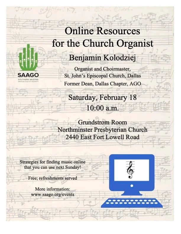 Benjamin Kolodziej presents often on topics of church music, history, organ and service playing, and sacred organ repertoire to AGO chapters, universities, and churches.